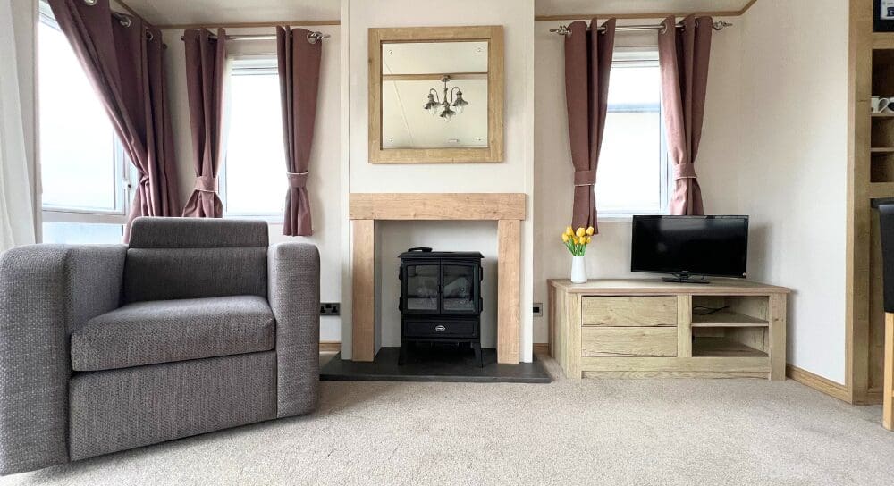 Flowing seamlessly into the living area, the ABI Westwood offers a bright and welcoming space thanks to its large windows and patio doors that flood the room with natural light. The soft neutral carpet, two matching lounge chairs, and freestanding oak TV unit create a cosy yet contemporary setting. A stove-style feature fireplace with an oak surround and matching wall mirror forms the heart of the room, while coordinated lighting and curtains with a subtle pop of colour bring the look together beautifully. This is the perfect space for family fun, socialising, and relaxed evenings in comfort.