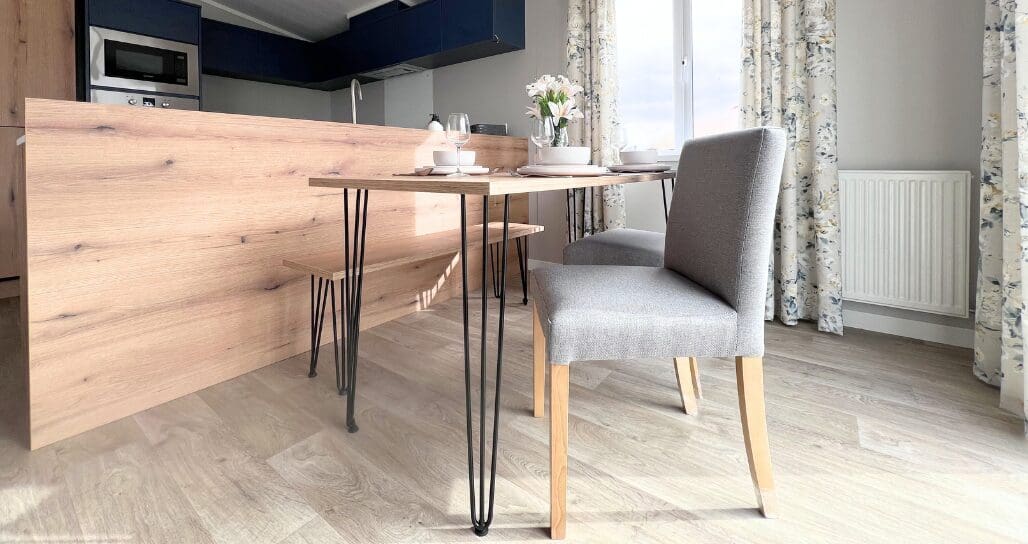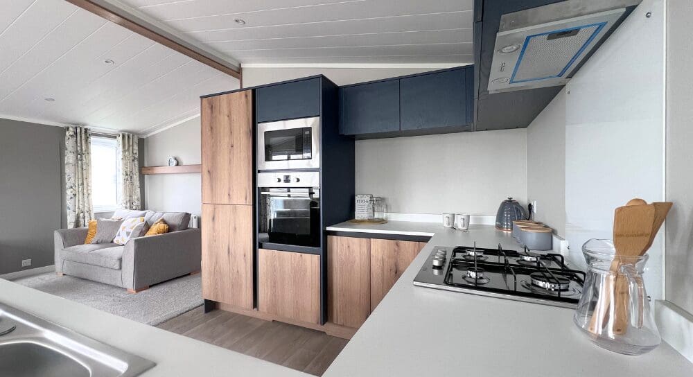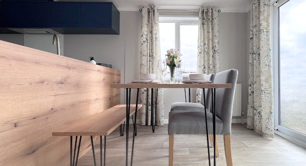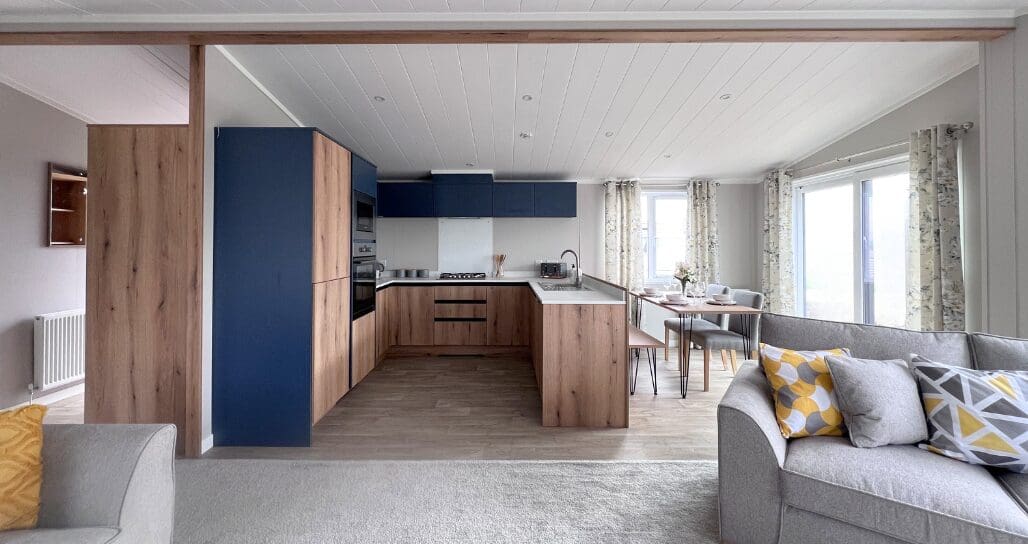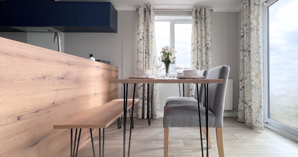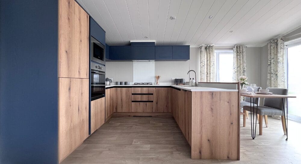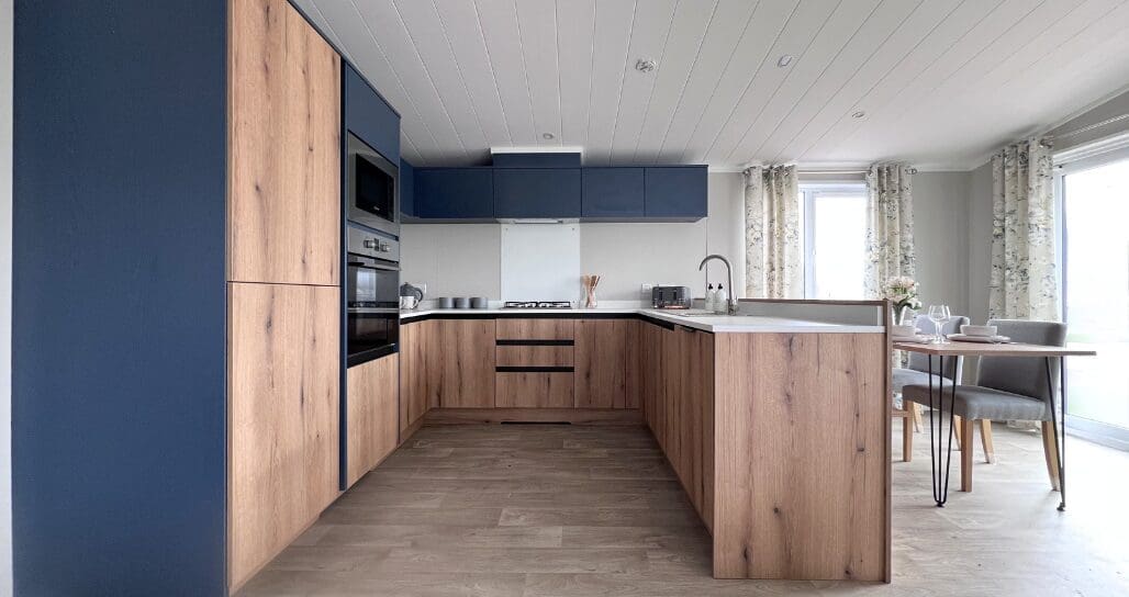 The impressive U-shaped kitchen features oak-effect cabinetry, crisp white contemporary worktops, and bold navy detailing within the frame and overhead cupboards. A modern fitted oven and hob sit beneath stylish cabinetry, with plenty of storage for effortless holiday living. The adjoining dining area is beautifully finished with an oak-effect bench and two light grey upholstered chairs, all framed by windows and gorgeous patterned curtains.