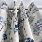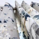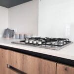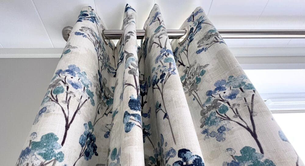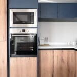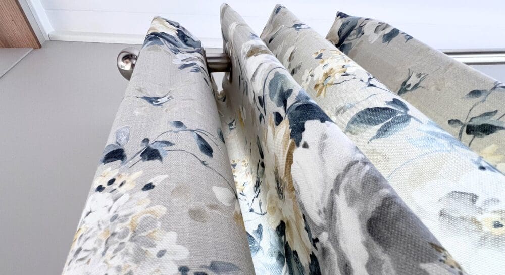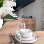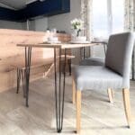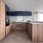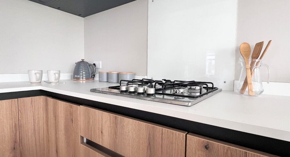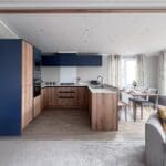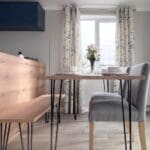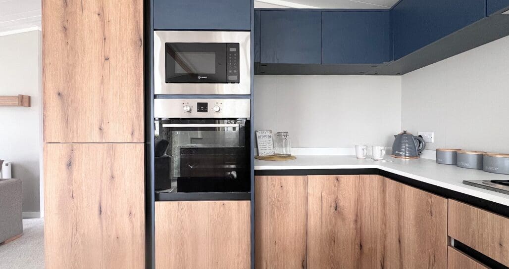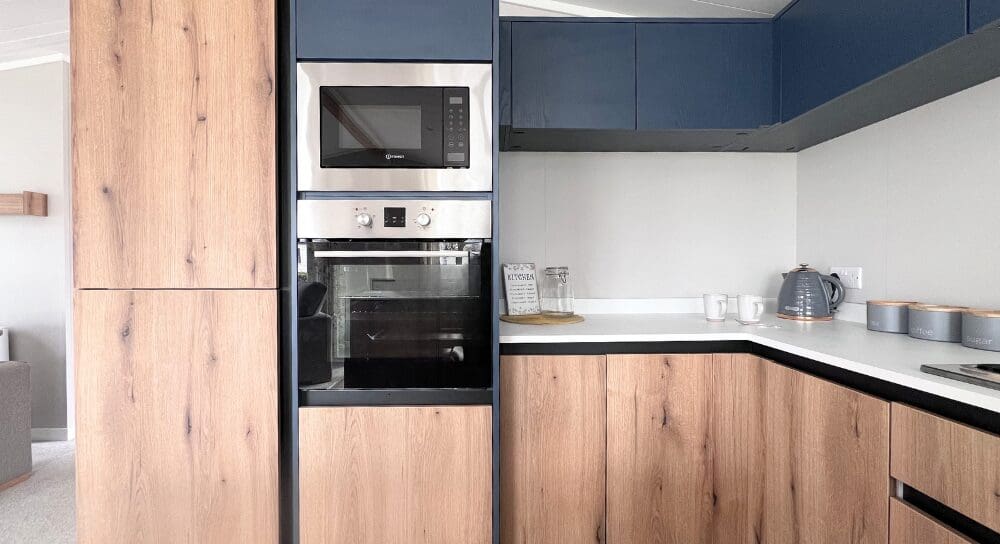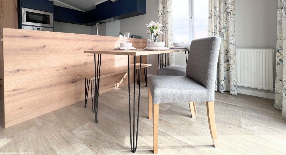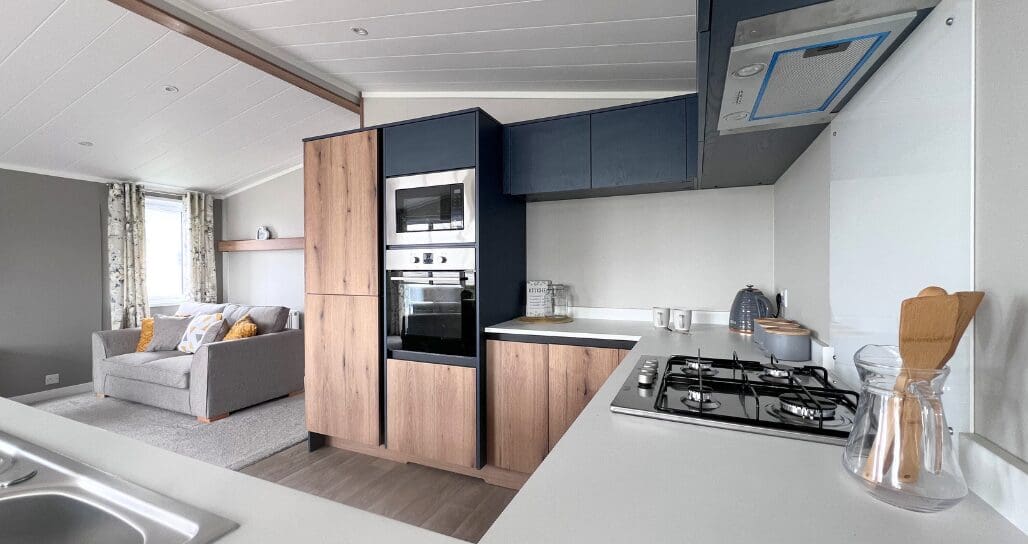 The impressive U-shaped kitchen features oak-effect cabinetry, crisp white contemporary worktops, and bold navy detailing within the frame and overhead cupboards. A modern fitted oven and hob sit beneath stylish cabinetry, with plenty of storage for effortless holiday living. The adjoining dining area is beautifully finished with an oak-effect bench and two light grey upholstered chairs, all framed by windows and gorgeous patterned curtains.