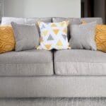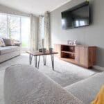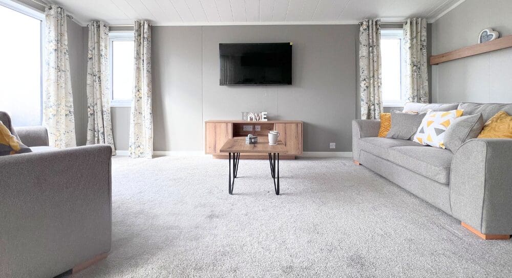 The lounge offers two large grey upholstered sofas accented with vibrant yellow scatter cushions, creating a welcoming yet modern feel. An oak coffee table and matching large TV unit complement the soft light grey carpet, while expansive windows and sliding patio doors flood the space with natural light, perfect for embracing indoor-outdoor living.