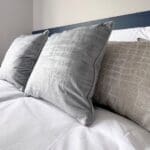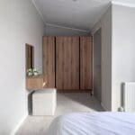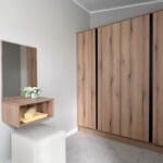 The master bedroom is generously proportioned, complete with a large comfortable bed, feature headboard, bedside tables, and a dedicated dressing area with upholstered stool and a wall mirror. A substantial four-door wardrobe provides excellent storage and leads through to a luxurious ensuite, showcasing a spacious shower with striking navy herringbone tiles and dual shower heads.