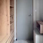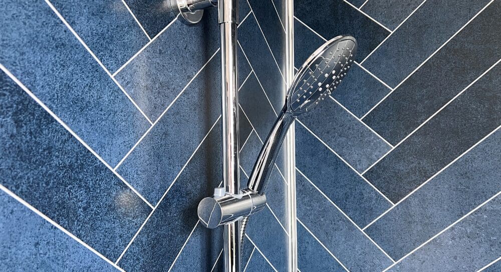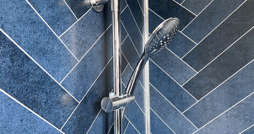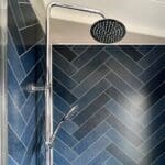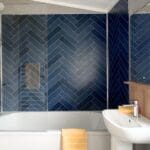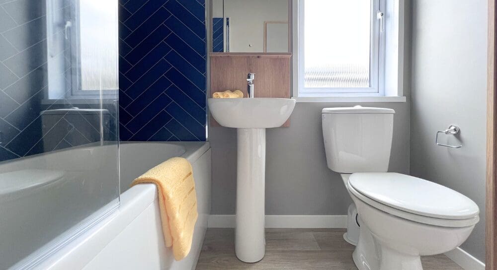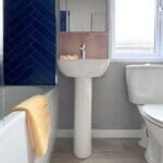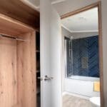 The twin bedroom is equally well-sized, offering ample space for children or guests, an open wardrobe dressing area, and convenient access to the main bathroom. The family bathroom is finished to a high standard, featuring a full-sized bath and coordinating navy herringbone tile detailing.
