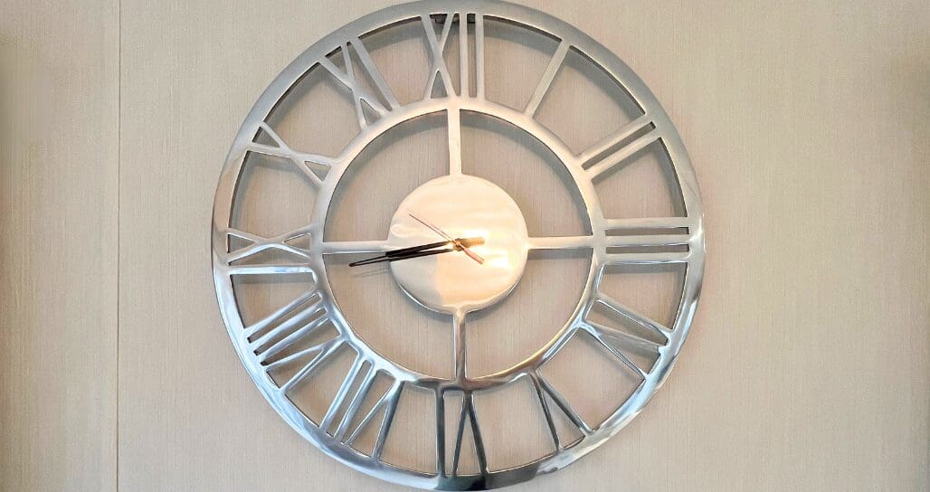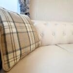 The living area is welcoming and wonderfully comfortable, finished with a soft, light carpet and an abundance of seating. A two-seater Chesterfield-style sofa, beautifully coordinated with the dining chair, sits alongside checked accent cushions and a matching footstool. An additional accent chair and two leather reclining chairs ensure there’s room for everyone to unwind. The space is completed by a feature fireplace, matching oak TV unit and lamp table, stylish curtains, and a statement wall clock that adds character and charm.