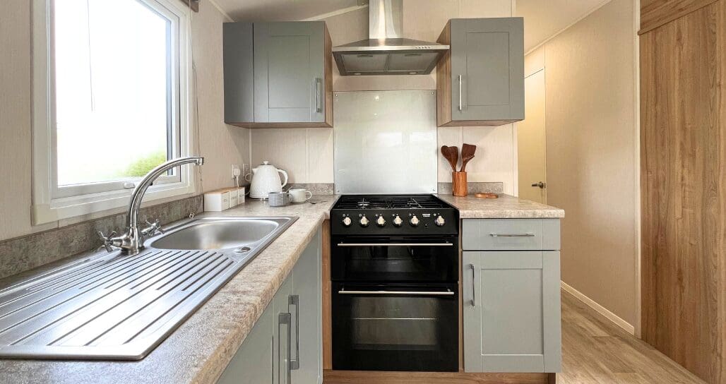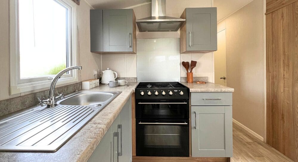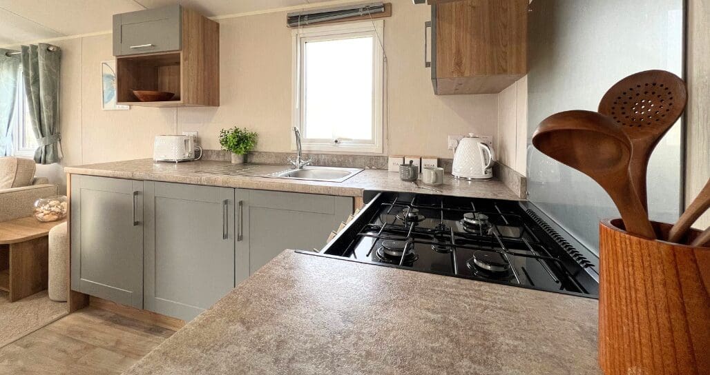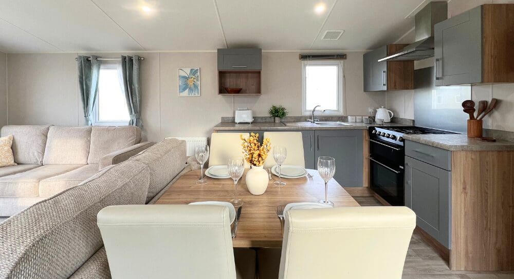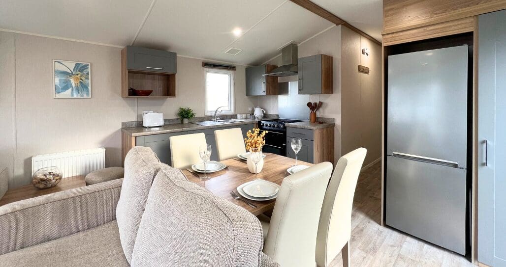 The heart of the home is the bright open-plan living- dining space, designed to feel spacious, sociable, and welcoming. The L-shaped kitchen offers plenty of room to cook and prepare meals, finished in modern grey cabinetry with stylish worktops and an oak frame for a warm, timeless look. Integrated features include a tall fridge freezer, modern oven, and hob, making everyday holiday living effortless.