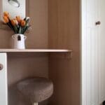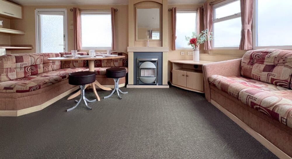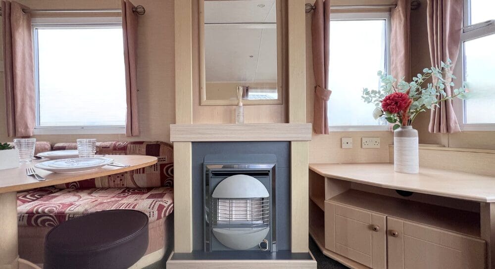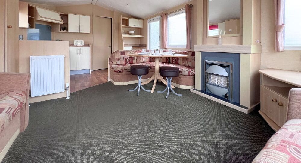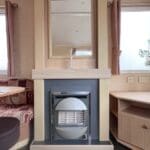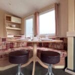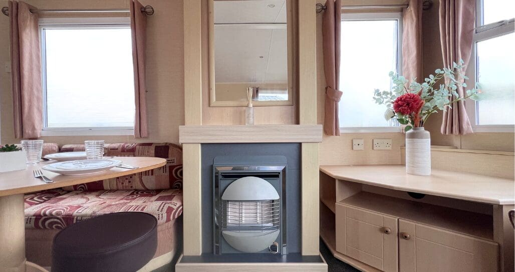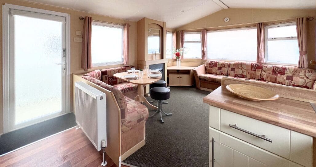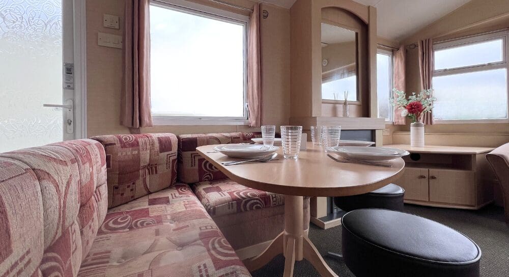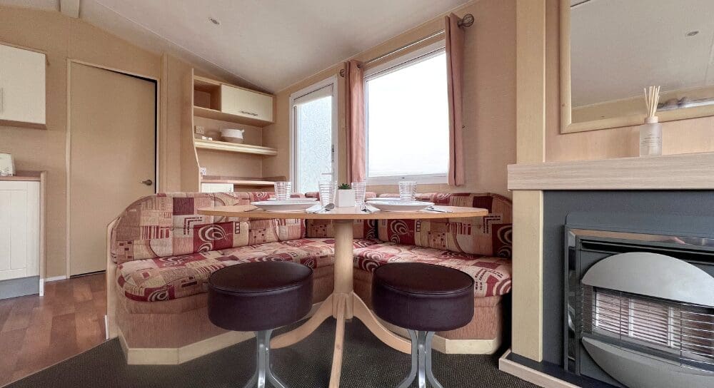 Step inside to discover a bright and spacious open-plan living area, perfect for relaxing and entertaining. The lounge features a large L-shaped fixed sofa, providing plenty of seating for family and guests, alongside a smaller matching corner bench unit. A stylish wood dining table sits at the heart of the space, complemented by two contrasting brown stools for additional seating. A stylish feature fireplace, large wall mirror, and TV unit complete the room, creating a warm and welcoming focal point.
