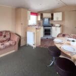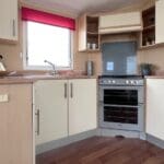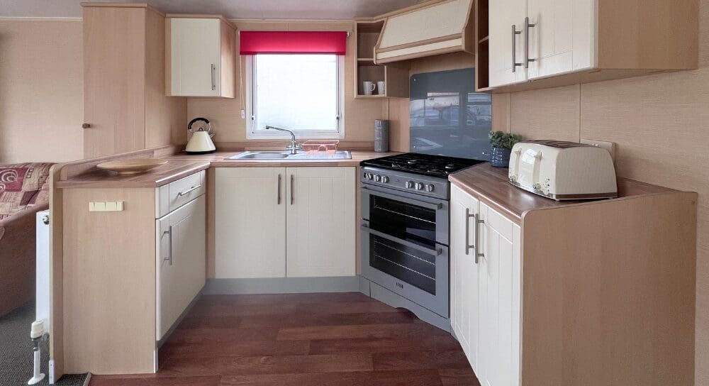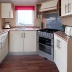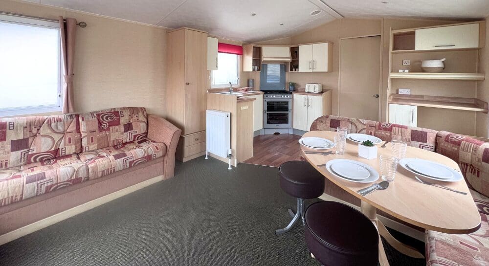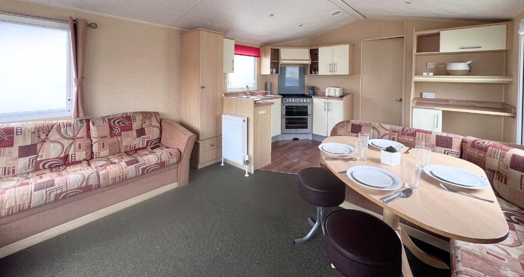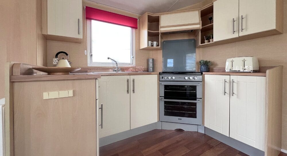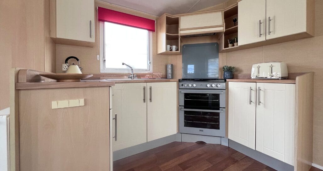 The U-shaped kitchen is both practical and attractive, finished with oak-style worktops, cream cabinet doors, and chrome handles for a clean, classic look. Equipped with an oven and hob, plus ample cupboard storage, the kitchen is well laid out for easy holiday cooking while remaining part of the sociable open-plan design.