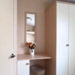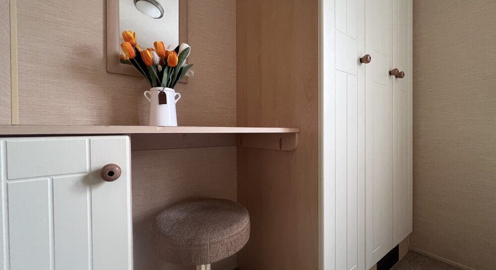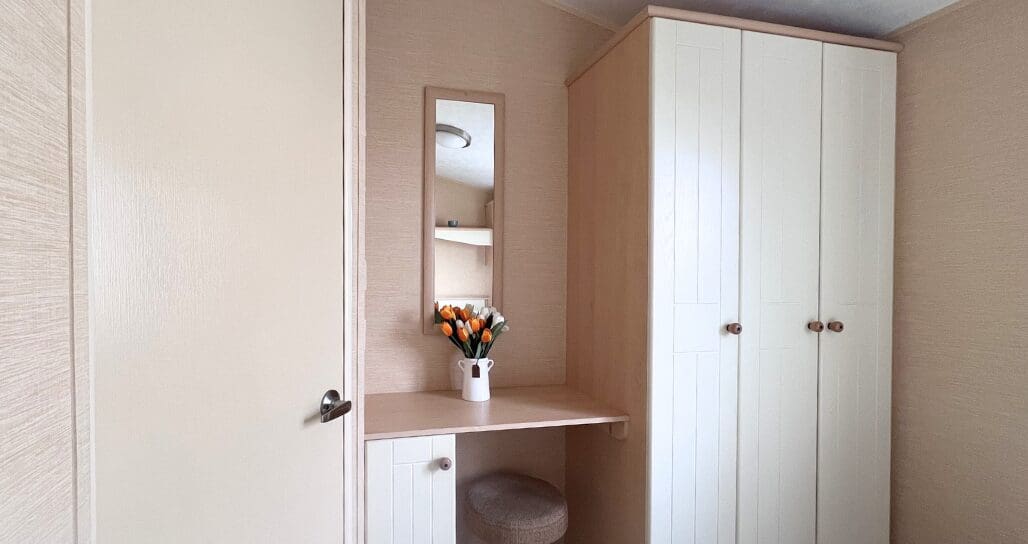 The master bedroom is a great size and thoughtfully designed, featuring shaker-style cream bedside cabinets, over-bed shelving, and additional storage units. A large triple wardrobe provides excellent storage, while a dedicated dressing area with stool and matching wall mirror adds convenience and style.