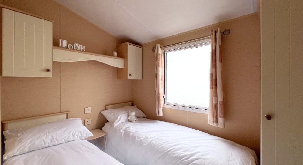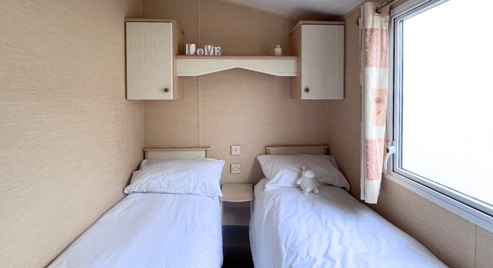 The twin bedrooms continue the cohesive shaker-style theme, complete with wall cabinets, shelving, bedside storage, and single wardrobes, ideal for children or visiting guests.