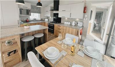 The kitchen is fully equipped with modern appliances, including a coffee machine, a large island and seating area with a dining table for family meals.