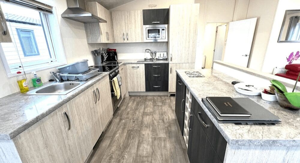 The 20 x 40 foot lodge has an open plan layout giving a spacious feel and is set on a fantastic plot with large garden, hot tub, wrap around decking, stunning countryside views to the rear and private parking for two cars. This beautiful lodge is the perfect place for a short break or holiday with family and friends.