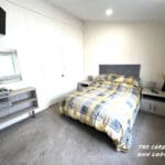 Master bedroom with double bed, wall mounted TV, dressing table and walk in wardrobe